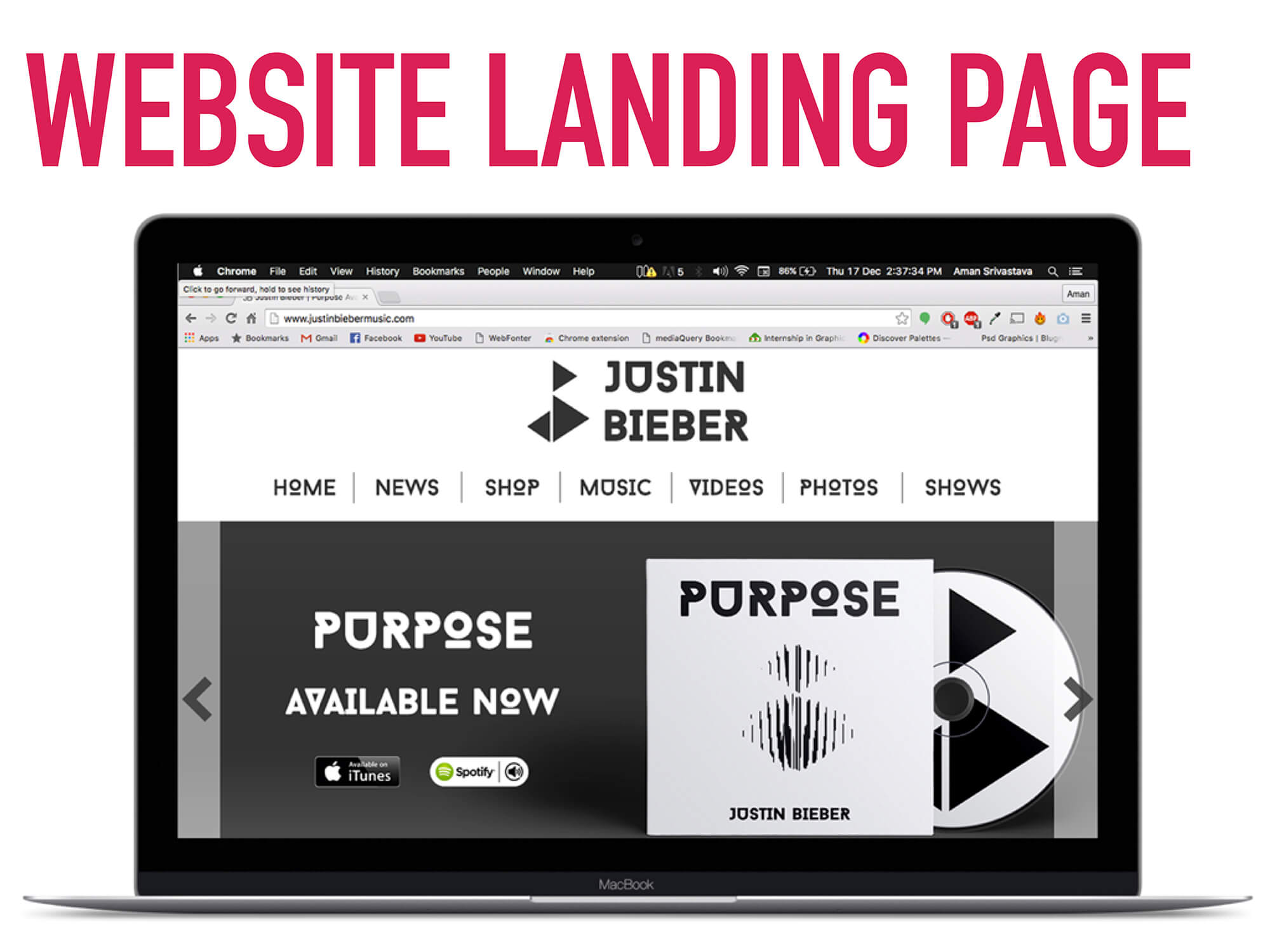 I found inspiration in one of his music videos from the album, and used that as a basis to redesign Purpose and rebrand him with a website and a business card.